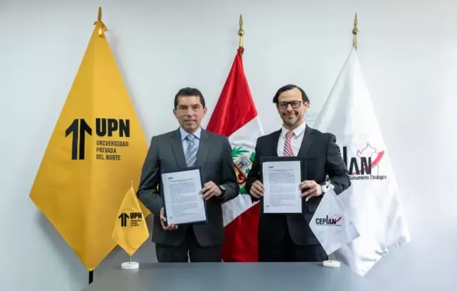 Firmamos un convenio de cooperación interinstitucional con el Centro Nacional de Planeamiento Estratégico (Ceplan), con el objetivo de establecer un marco de colaboración que permita desarrollar iniciativas conjuntas en materia de planeamiento estratégico para fomentar la formación continua, la investigación académica y el desarrollo nacional.
