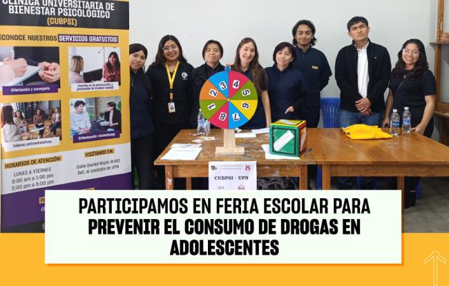 En el marco del compromiso con el bienestar comunitario y la promoción de estilos de vida saludables, a través del Centro de Innovación para el Desarrollo Sostenible (CIDES), la Clínica Universitaria de Bienestar Psicológico (CUBPSI) y la Clínica Legal, participamos como invitados en la Feria Multisectorial “A las drogas dile no”, dirigida a estudiantes de secundaria de la I.E. 80823 El Indoamericano.